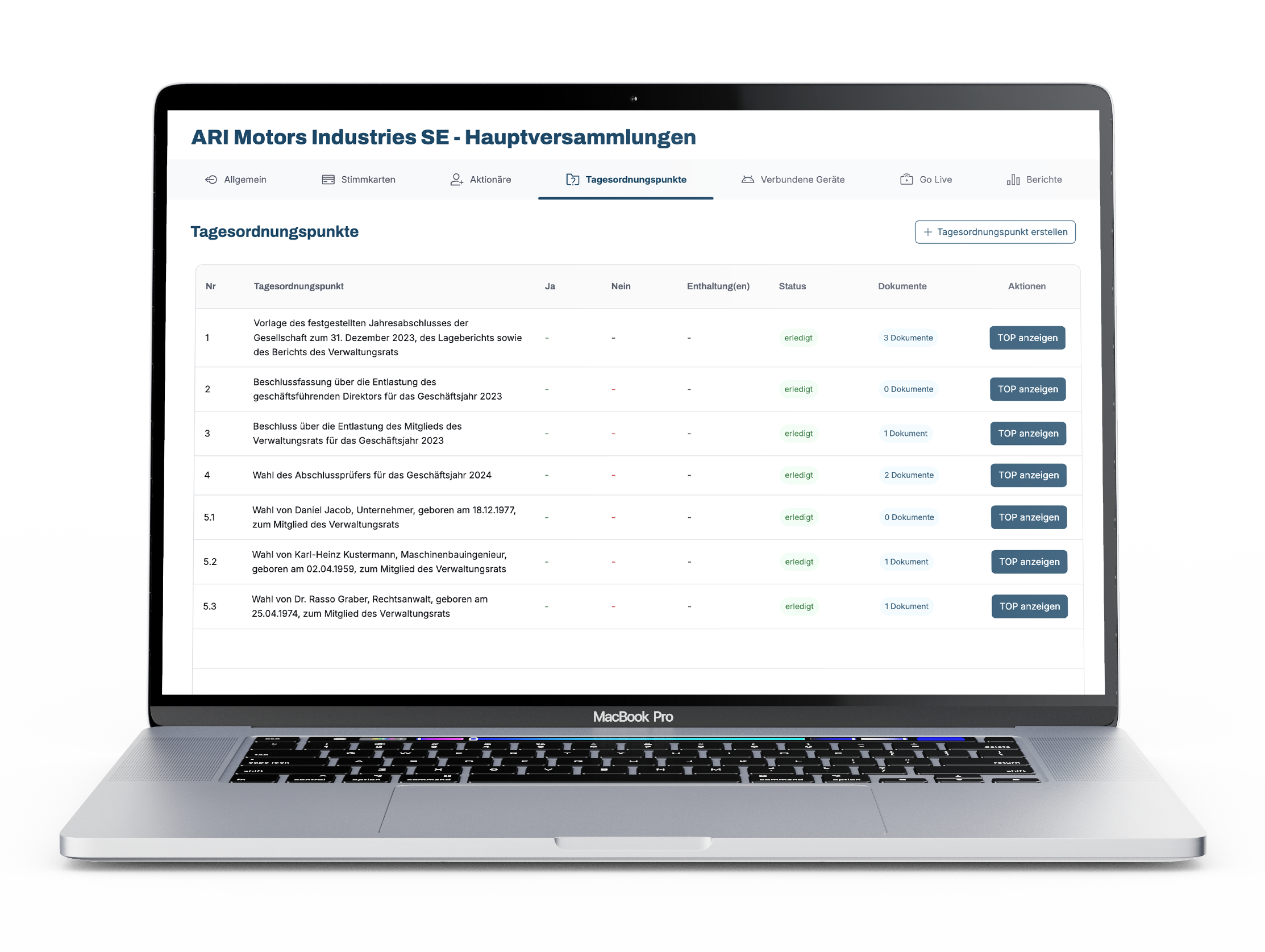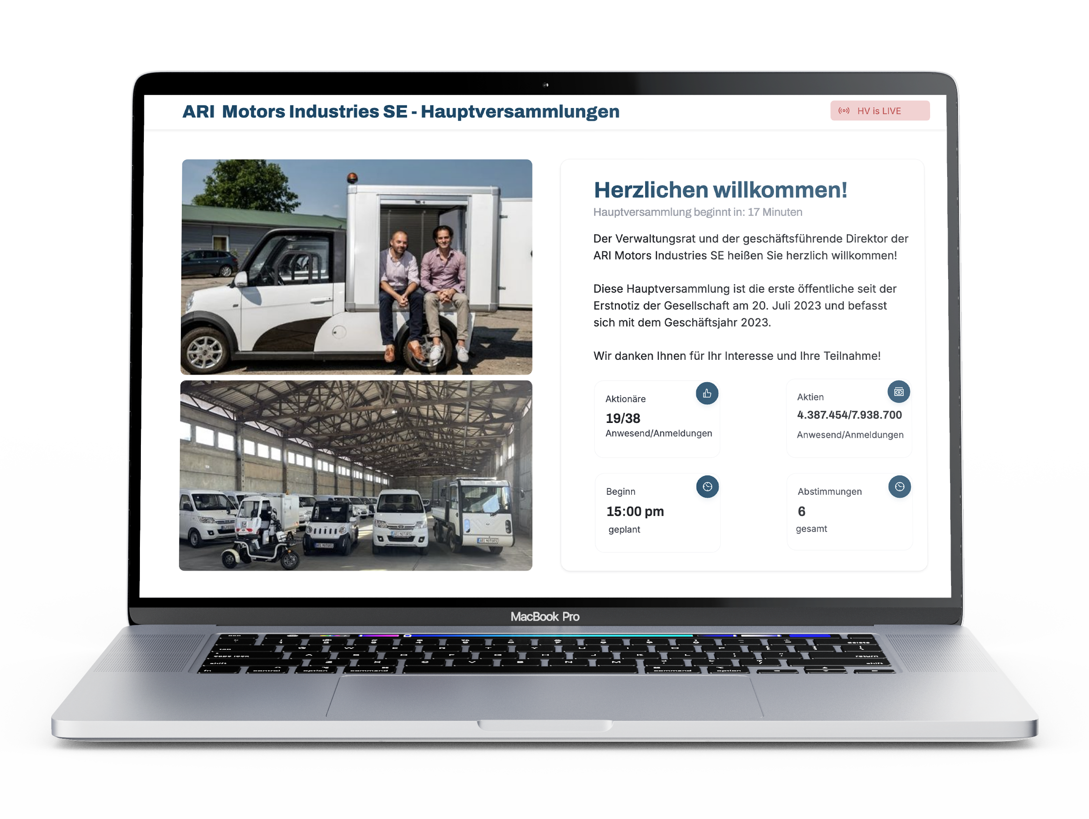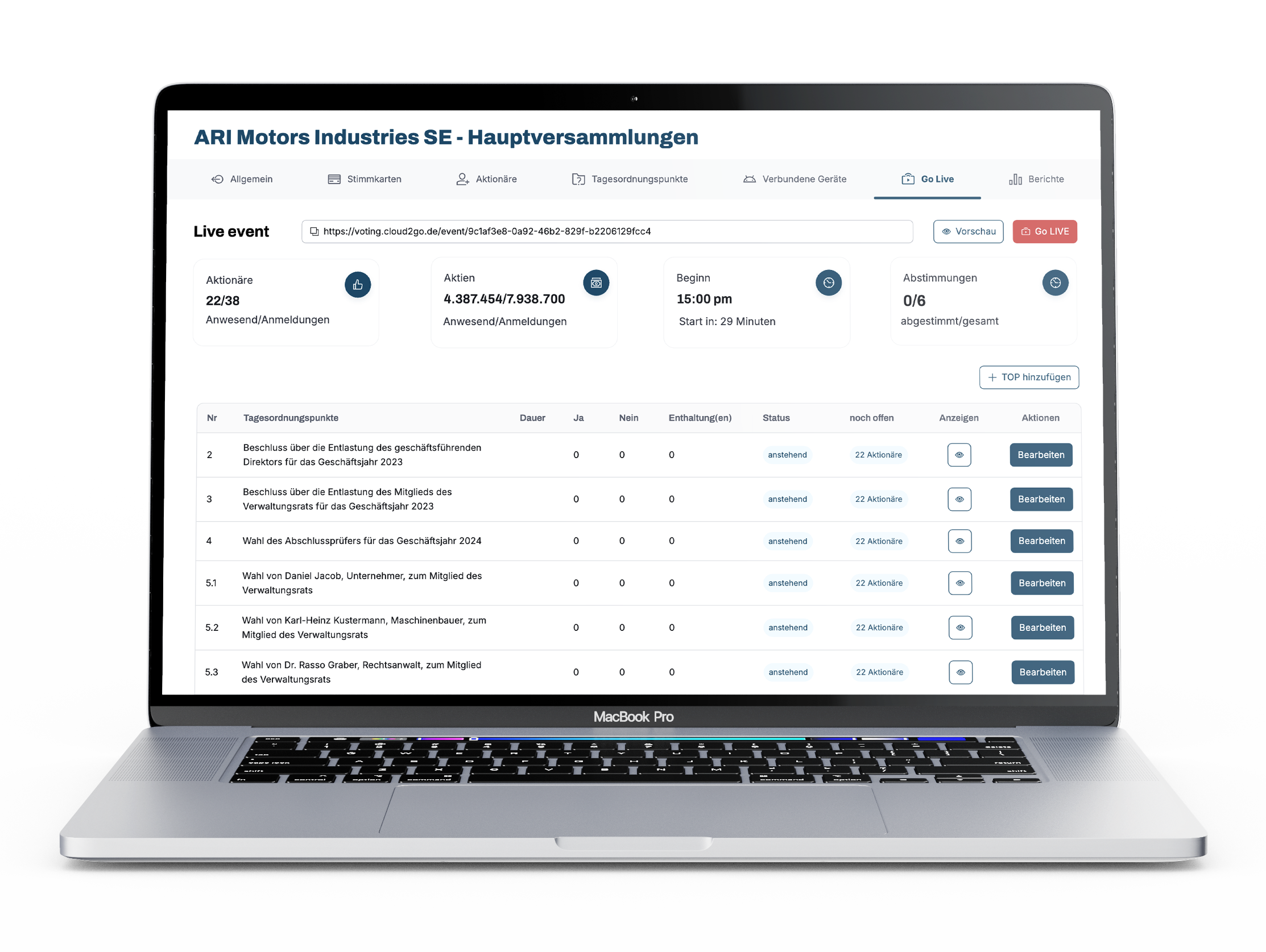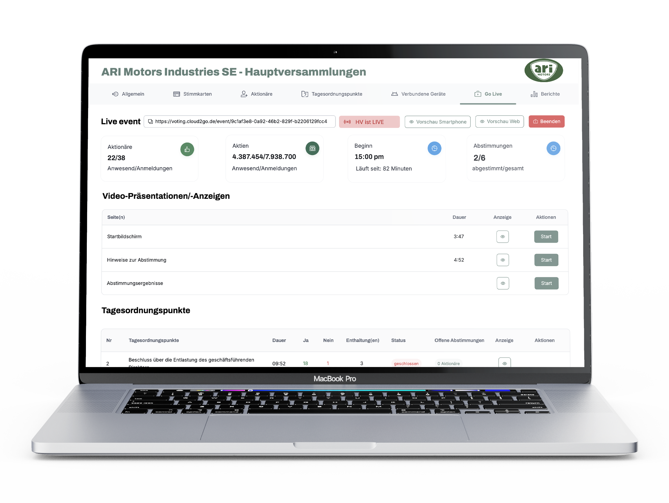 Zusätzlich werden die Anzahl der Tagesordnungspunkte zur Abstimmung sowie der Startzeitpunkt der Hauptversammlung angezeigt.